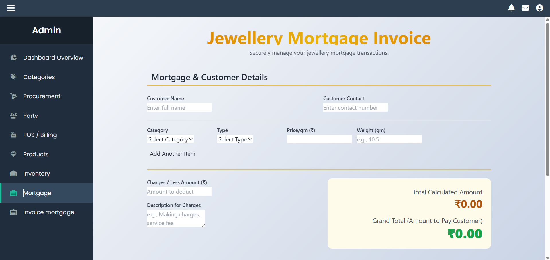 modern and fully dynamic jewellery management system combined with an elegant landing website for showcasing the brand�s premium jewellery collection. The landing page features sections for banners, collections, categories, offers, and a clean UI that reflects luxury and trust. The website is built using PHP, MySQL, and Tailwind CSS to ensure fast performance, responsive design, and smooth navigation. The backend software provides complete digital control over jewellery inventory, category structures, pricing, and transactions. The admin can easily manage categories like Gold, Silver, Diamond, and further sub-categories such as 20 Karat, 22 Karat, 24 Karat, and more. A dedicated Daily Jewellery Price Update Module allows the admin to update gold/silver rates daily, which reflect across the system instantly. One of the major features is the Mortgage (Girvi) Management System, where customers can mortgage jewellery, and the system tracks weight, value, interest, payment history, and due amounts automatically. The platform also stores all transaction histories, invoices, and customer records for complete transparency. ShreeRatnam simplifies inventory management, rate tracking, mortgage tracking, and sales operations�making it a powerful all-in-one solution for jewellery shops.