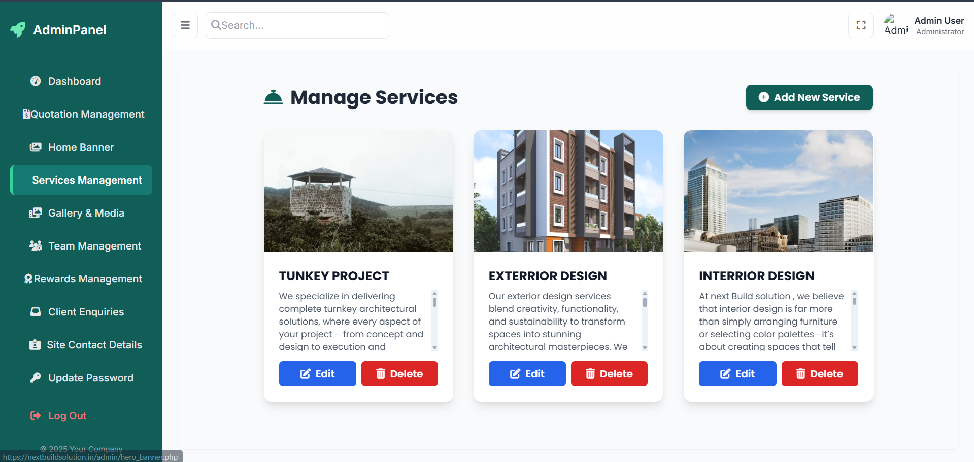 NextBuildSolution.com is a fully dynamic and feature-rich construction and interior service management platform developed to streamline client interaction, service showcasing, and internal business operations. The website is built with a modern UI/UX using Tailwind CSS and powered by PHP and MySQL for efficient backend processing. The hero section, services, and sub-services are completely dynamic, allowing the admin to update content anytime without touching code. A dedicated team management module enables the client to display their workforce, expertise, and achievements, while a rewards section highlights the company�s credibility. One of the core highlights of the system is the advanced Quotation Management Module, which captures detailed client requirements including plot size, square feet measurements, height, length, and other technical specifications. It automatically stores all inputs in the database and assists the admin in generating accurate quotations. Additionally, the system includes payment tracking, client information management, and a smooth workflow for handling enquiries. With a professional look, responsive layout, and efficient admin dashboard, the platform ensures seamless management for both visitors and the business team, making it a complete solution for modern construction service companies.